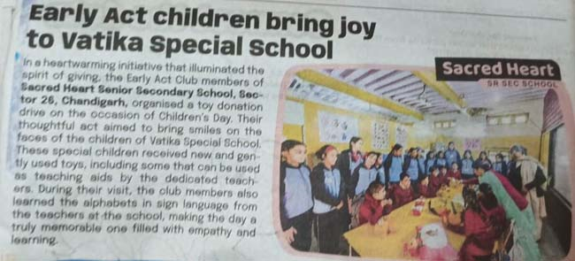In a heartwarming initiative that illuminated the spirit of giving, the Early Act Club members of Sacred Heart Senior Secondary School, Sec-26, Chandigarh, organized a toy donation drive on the occasion of children’s Day. Their thoughtful act aimed to bring smiles on the faces of the children of Vatika Special School. These special children received new and gently used toys, including some that can be used as teaching aids by the dedicated teachers. During their visit, the club members also learned the alphabets in sign language from the teachers at the school, making the day a truly memorable one filled with empathy and learning.