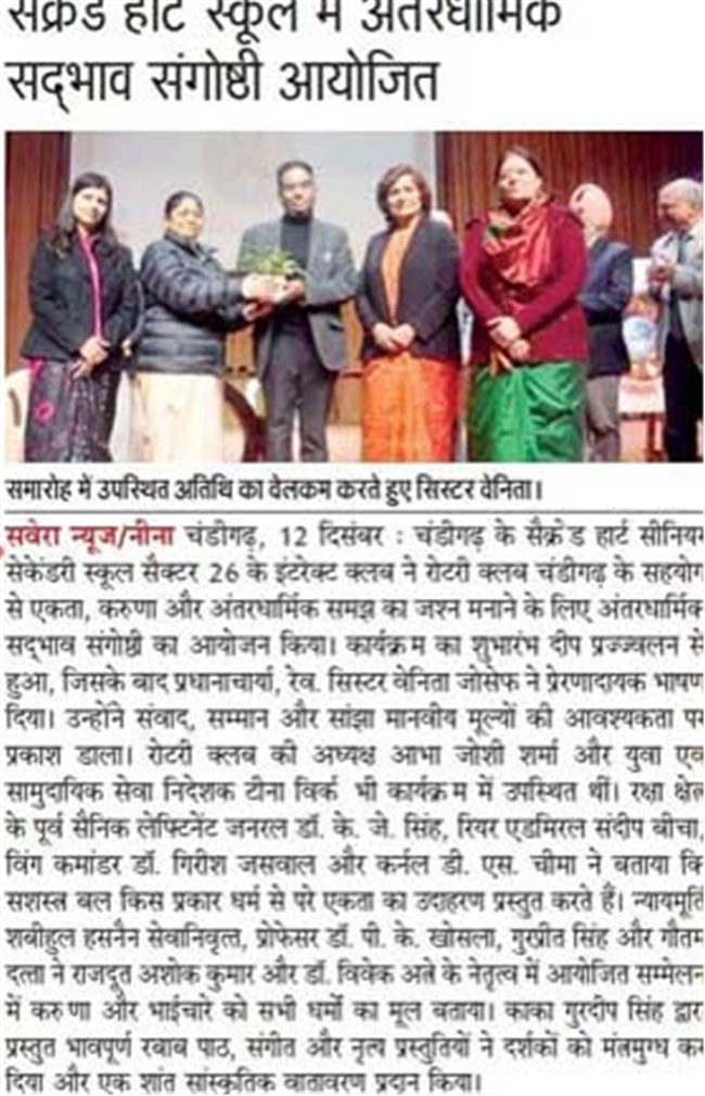 To foster interfaith harmony, an event was organized at Sacred Heart Senior Secondary School, Sector-26, Chandigarh. An Interfaith Harmony Symposium was held with the objective of promoting mutual understanding, peace, and brotherhood among followers of different religions. Scholars and representatives from various faiths participated and shared their perspectives. The speakers emphasized that all religions teach the values of love, compassion, tolerance, and humanity. They said that religion should become a means of unity rather than division. The need for dialogue and respect among different faiths was strongly highlighted, especially in today’s social environment. The program saw active participation from students and teachers. Through speeches and discussions, students were encouraged to develop a spirit of inclusiveness and respect for all religions.