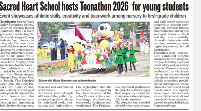 Event showcases athletic skills, creativity and teamwork among nursery to first-grade children Chandigarh: Sacred Heart Senior Secondary School, Sector 26, recently hosted Toonathon 2026, a lively sports event celebrating the talents and energy of students from nursery to first grade. The event combined athletic competitions with creative performances, allowing children to showcase their skills while dressed as popular cartoon characters, ranging from superheroes to princesses. The celebration was attended by School Manager Rev. Sister Anupa, Principal Rev. Sister Venita Joseph, Vice Principal Sister Sush, and Head Primary Rev. Sister Alvina, who actively encouraged participants throughout the event. Parents were also present, enthusiastically cheering and applauding their children during races, exercises, and coordinated performances. Rev. Sister Venita Joseph addressed the students, commending their hard work, dedication, and high spirits. She highlighted the enthusiasm displayed by the children and reflected the school’s core values and teachings, emphasizing teamwork, discipline, and confidence. The Principal also expressed gratitude to the parents, acknowledging their support in making the event memorable and enjoyable for the students. The competitions included colorful races, relay events, and skill-based exercises designed to develop coordination, physical fitness, and confidence among the youngest learners. Each activity was carefully planned to balance fun with learning, ensuring a meaningful experience for participants. Toonathon 2026 successfully combined athletic fun with imaginative play, fostering a sense of camaraderie and joy among students. The event not only celebrated the children’s talents but also reinforced the school’s commitment to holistic education, providing an environment where physical, creative, and social development are equally encouraged. The occasion was a vivid demonstration of the school’s focus on nurturing well-rounded individuals from an early age.