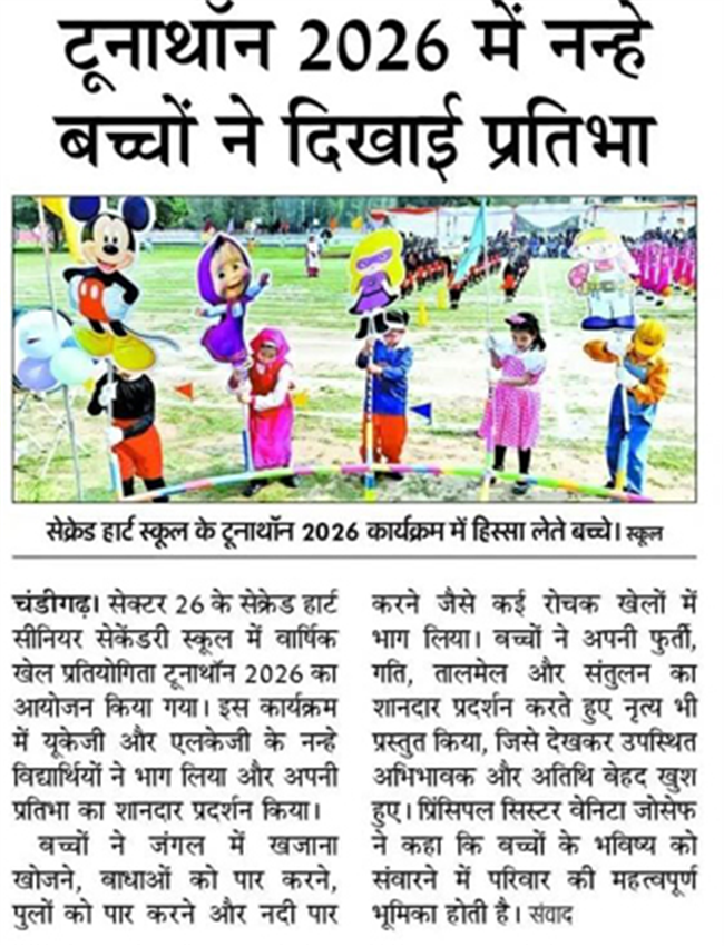 Sacred Heart Senior Secondary School, Sector 26, organized its annual sports festival Toonathon 2026. Children from Nursery to Grade 1 participated enthusiastically in the event. The program aimed to promote students’ physical development and confidence. Various fun games were organized for the children, including jumping, balancing, crossing bridges, and other obstacle activities. The children also showcased their enthusiasm by wearing colorful costumes of cartoon characters and giving cheerful performances during the event. School Principal Sister Venita Joseph said that such programs play an important role in shaping the bright future of children and strengthening family values.