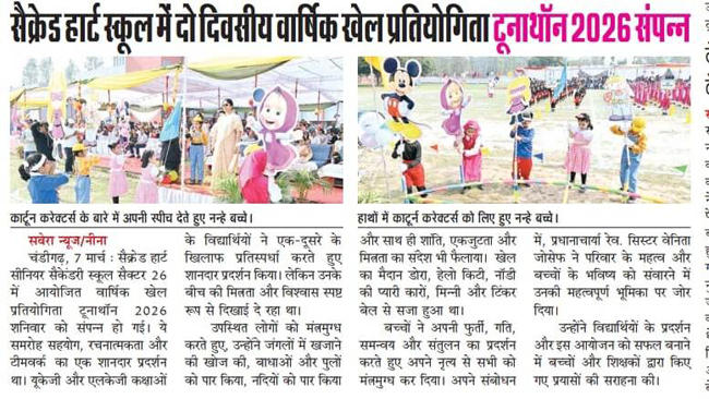 The two-day annual sports competition “Doathon 2026” organized at Sacred Heart School concluded on Saturday. On the closing day, Card Collecting was the main attraction. The theme of the game was based on Duke and the Pancake story. In this game, children ran with cards in their hands and collected them. While doing so, they learned about teamwork, patience, and quick decision-making. The competition was held among the school houses, creating enthusiasm and a spirit of sportsmanship among the students. The children participated enthusiastically and displayed their talent. The event helped develop confidence and leadership qualities among the students. Teachers and parents appreciated the efforts made by the students and the school administration in successfully organizing the event. The program concluded with encouragement and appreciation for all participants.